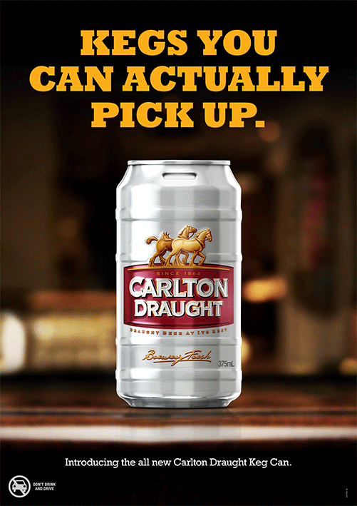 Made from beer advertising campaign started from the highly awarded Big Ad. in 2013 he Keg Can, designed by Cowan design, replaced all existing Carlton Draught cans with some eye-catching merchandising kits. In Carlton Draught’s home state of Victoria, an outdoor advertising campaign, via Clemenger BBDO Melbourne, hit the streets with posters promoting the new cans..